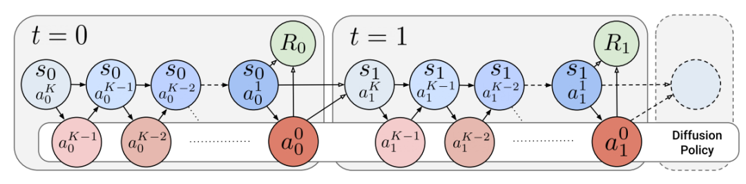 ▲图2|研究人员将扩散策略中的去噪过程视为一个MDP,整个环境可以认为是一个MDP的链路