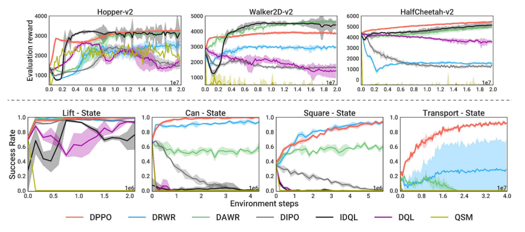 在OpenAI Gym的三个运动基准任务(Hopper - v2、Walker2D - v2、HalfCheetah - v2)和ROBOMIMIC的四个模拟机器人操作任务(Lift、Can、Square、Transport)上,研究人员将DPPO与多种基于扩散的RL算法进行了比较。结果表明,DPPO在不同任务中表现出一致的性能,具有良好的训练稳定性和较高的微调成功率。在一些具有挑战性的任务中,如ROBOMIMIC的Transport任务,DPPO的性能明显优于其他算法。