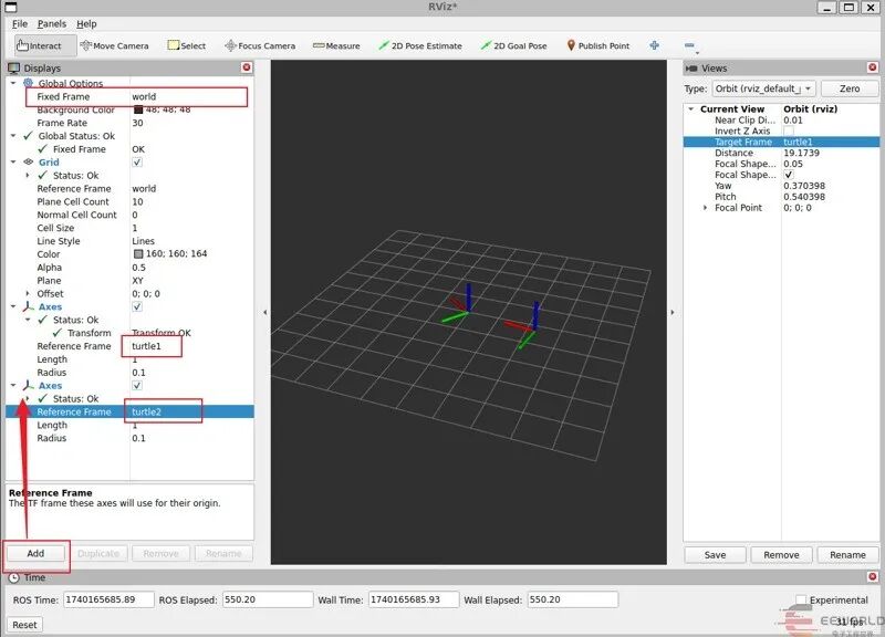 ros2 run rviz2 rviz2 弱弱提示: RViz可以点击左下角的Add按钮添加显示类型,添加两个坐标轴之后,设置引用的坐标系为对应的海龟即可。另外记得把全局坐标系设置为world !