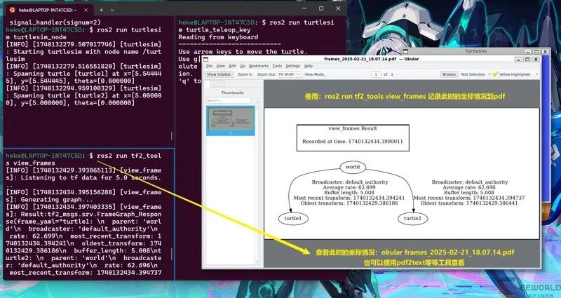 注意:TF只管根据广播的坐标系关系维护坐标系树,以便于其他节点随时通过监听器获取位置和姿态 其中位置控制还得靠自己对应的功能模块!比如你即使广播B在A的X=233处,但是你实际上没有让海龟Move(X=233),那么你就仅仅是谎报坐标了而已!一般情况下,携带里程计的机器人模块会有里程计回调自动更新里程计坐标系相对于世界/地图坐标系的偏移。