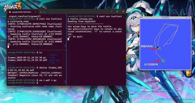 # 海龟1: ros2 run turtlesim turtlesim_node # 海龟1的键盘控制 ros2 run turtlesim turtle_teleop_key # 海龟2,别忘记启用ROS2工作空间/install/setup.bash的环境! ros2 run turtle2node heke 效果展示: